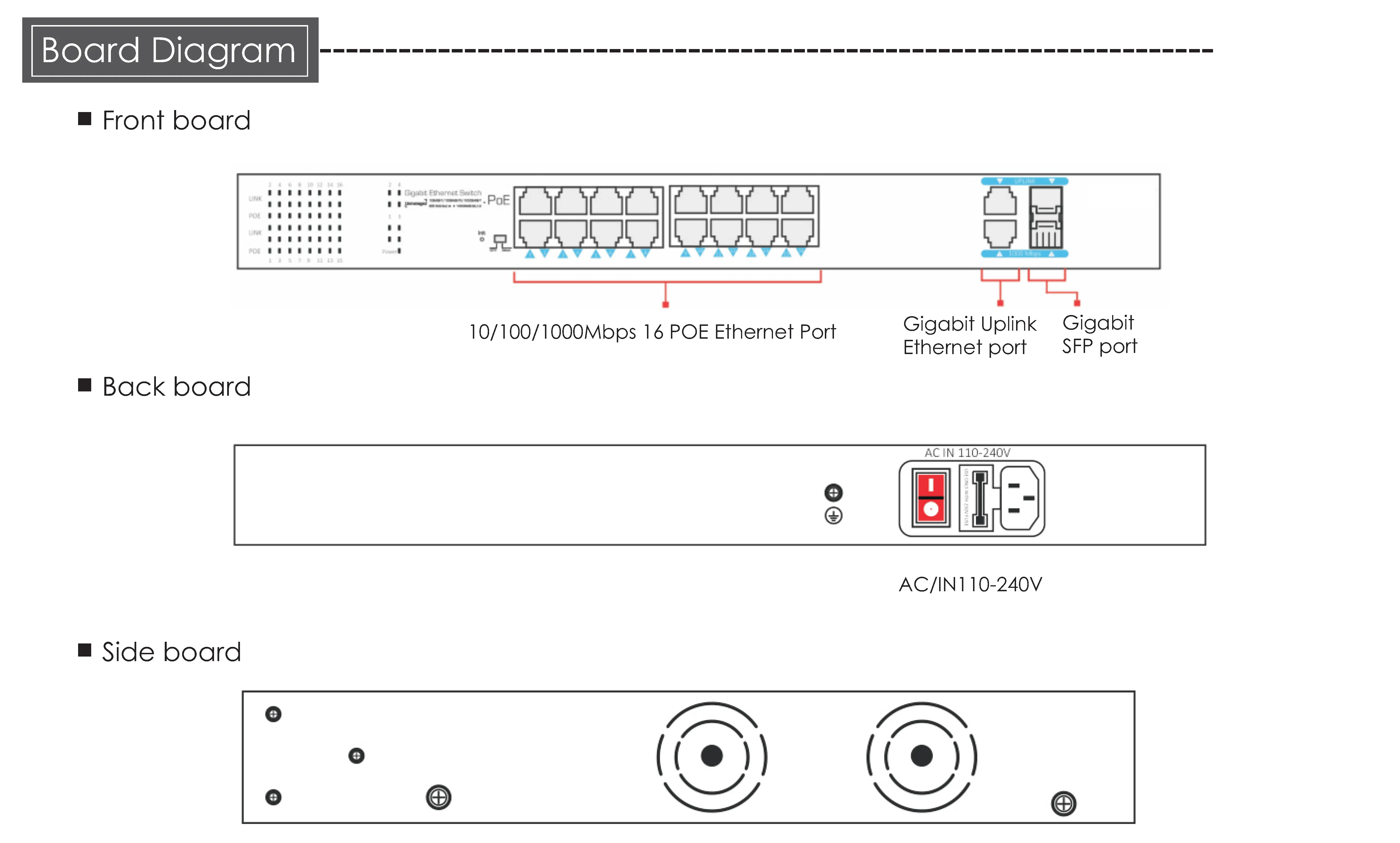 - 16x 10/100/1000Mbps downlink PoE Ethernet Ports, 2x 10/100/1000Mbps uplink Ethernet Ports and 2x 1000Mbps uplink SFP Ports;